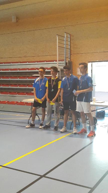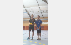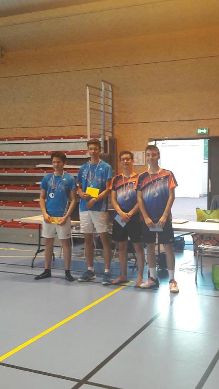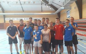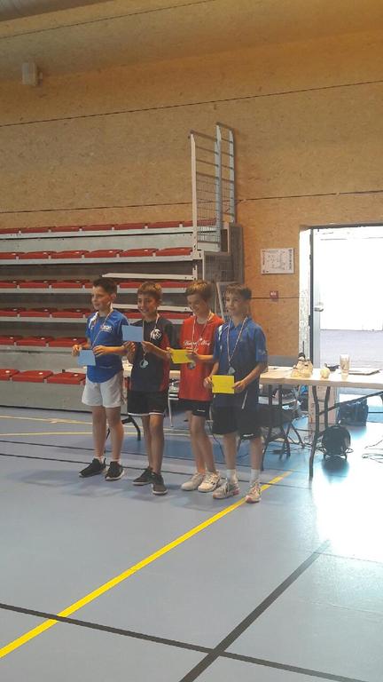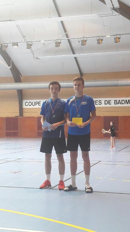 La Coupe des Yvelines jeunes s'est jouée à Voisins, gymnase des Pyramides, les 10 et 11 juin 2017. Cette compétition est ouverte des poussins aux juniors sur 4 tableaux: SH, SD, DH, DD. Pas de DMx 47 jeunes vicinois s'y sont inscrits. Résultats du Samedi: Victoire en DH Cadets de Killian DECHAMPS, associé à Matis BOSSUAT (MYBad) Finale en DH juniors de Clément POTTIER et Pacôme RICHARD Finale en DH Benjamins de Quentin VIARD et Flavien PENN , après une 1/2 finale épique avec plein de rebondissements; Menés 11/3, puis 18/12 et 20/15 dans le 1° set, ils s'arrachent et gagnent 22/20 devant des adversaires désemparés. Au 2° set, ils ont 5 volants de match à 20/17, puis 21/20, puis 22/21 avant de perdre le set 22/24. Au 3° set, ils mènent tout le set avant de perdre 2 volants de match à 20/17, puis 20/18. A 20/19, Quentin et Flavien se jettent tous les deux sur un volant en se gênant. Finalement, aucun des deux ne le touche et le volant sort de 10 cm. Match gagné! Autres résultats: 3° place en DH juniors pour Vincent BARRAS et Sébastien LECLERC, ainsi que pour Clara CAYLA en SD Juniors. 1/2 finale en DH cadets pour Pierr SOLEILLANT et Louis FERRAND,pour Louna BORDET en SD cadettes. 1/4 de finales pour Ethan PETIT et Julien BIROT en DH cadets, pour Alexandre FUENTES en SH poussins 1/8° de finale pour Maximiliano BERTE en SH minimes En SH minimes, Aurélien GOUMAIN, Romain VIARD, Thibault DE ANDRIA gagnent 1 match sans sortir de poules. Comme Laure DERAET et Elisa BILBAO en SD Minimes, Hugo RAVEL et Thomas SMITH, Antoine GRIL et Anton ROGER en DH cadets, Manon RICHARD en SD benjamines, Aurore BOURRET en SD cadettes et Laure BOUDIER en SD Juniors. Enfin, Grégoire MOREL-POULIQUEN en SH Minimes, Ewan LE GALL et Maxence JOURDHEUIL en DH Benjamins, Albane PAJOT en SD cadettes, Maelys RAVEL en SD minimes et Roxane GUEVILLE en SD Juniors ne gagnent aucun match. Résultats du Dimanche: Victoire pour Baptiste GOUMAIN en SH cadets Finale pour Sébastien LECLERC en SH juniors 1/2 finales en SH cadets pour Clément POTTIER et Killian DECHAMPS, en SH juniors pour Pacôme RICHARD et Vincent BARRAS, pour Aurélien GOUMAIN en DH minimes associé à Kylian FOURNIER(Porcheville), pour Manon RICHARD et Elise LURIOT en DD benjamines. 1/4 de finales en SH cadets pour Ethan PETIT et Julien BIROT, en SH benjamins pour Quentin VIARD et Ewan LE GALL. 1/8 de finale en SH cadets pour Louis FERRAND et Pierre SOLEILLANT. En SH cadets, Antoine GRIL, Anton ROGER, Erwan RODOLFO, Hugo RAVEL, Hugo BORON, en DD cadettes, Aurore BOURRET et Marie DERAET, en SH juniors, Benjamin DINOTO, en SD poussines, Maud BERTE gagnent un match sans sortir de poules. Enfin, en DH minimes, Grégoire MOREL-POULIQUEN et Jeremy SAURA DEL-FABBRO, en SH benjamins, Flavien PENN, en SH cadets, Thomas SMITH ne gagnent aucun match. |