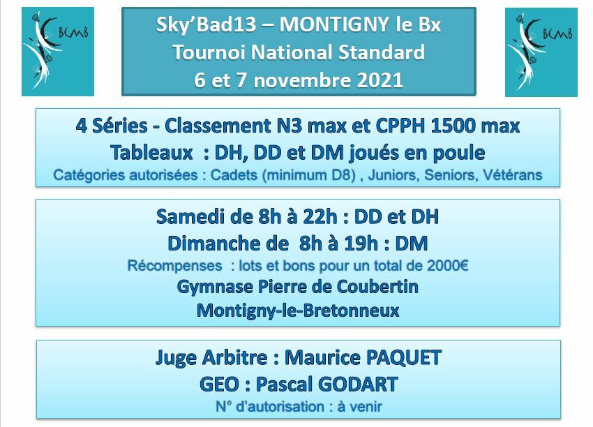 Le club de Montigny le Bx est heureux de vous accueillir à la 13ème édition de son tournoi : le Sky'Bad13.