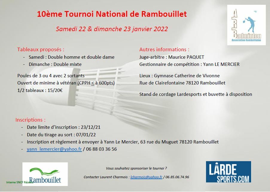 Les 22 et 23 janvier 2022 auront lieu la 10ème édition de notre tournoi de badminton à Rambouillet, le Rambolibad 2022.