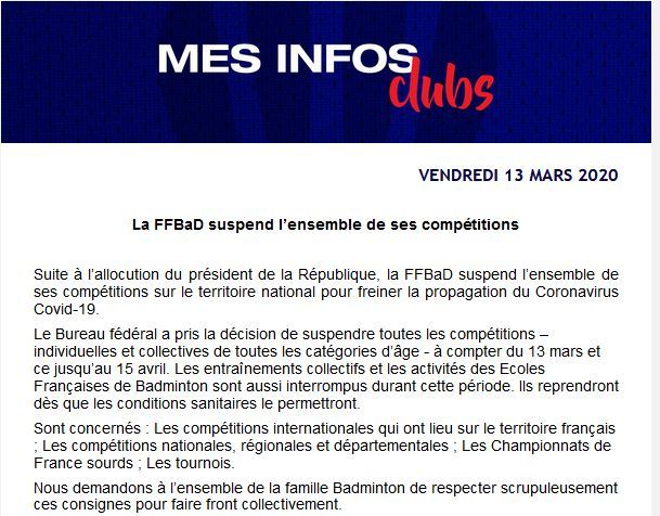 Le Bureau fédéral a pris la décision de suspendre toutes les compétitions – individuelles et collectives de toutes les catégories d’âge - à compter du 13 mars et ce jusqu’au 15 avril. Les entraînements collectifs et les activités des Ecoles Françaises de Badminton sont aussi interrompus durant cette période. Ils reprendront dès que les conditions sanitaires le permettront.